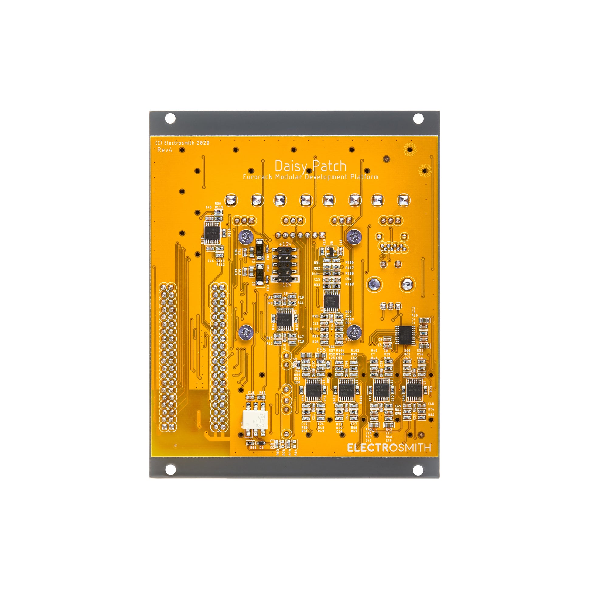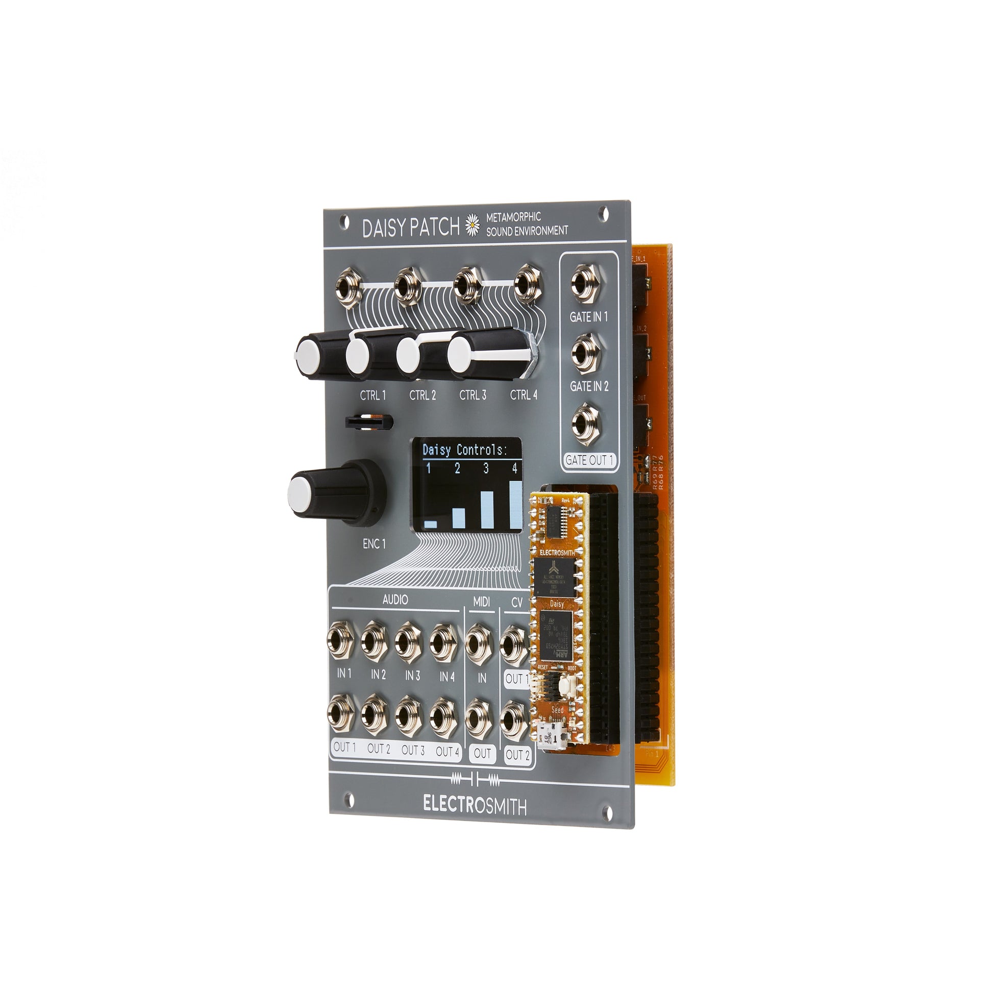Daisy Patch is a metamorphic sound environment capable of becoming an infinite variety of digital instruments. Patch is based on the Daisy embedded DSP platform and features quad 24-bit audio IO. The hardware itself is a blank slate ready to be brought to life with one of the many available firmware files which can be uploaded through our web programming interface. This library of instrument files includes samplers, granular processors, physical modeling voices, and more, and requires no special software to upload other than a web browser.